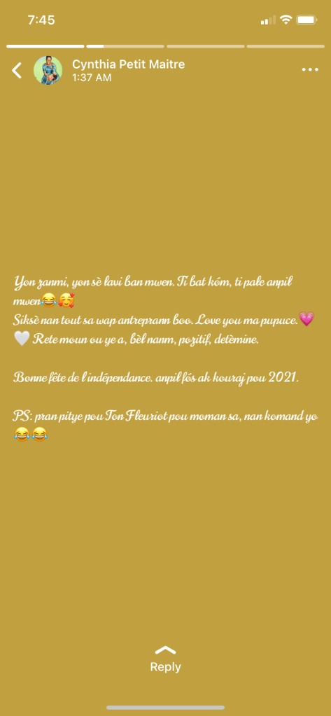 PS: Mon vœux d’anniversaire : où que vous soyez, prenez le temps de remercier les Pères de l’indépendance Haïtienne!!! Ils ont ouverts la voie en 1804 au plus changement de l’histoire de l’humanité!